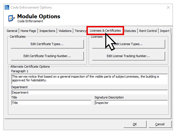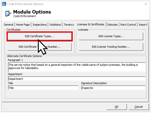 Click OK— Review all your changes and click OK to save the new Certificate Type, again to close out of the Certificate Type Manager, and lastly exit the Code Enforcement Options.