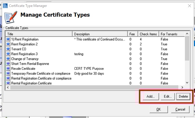 In the Manage Certificate Types window, you have 3 options: