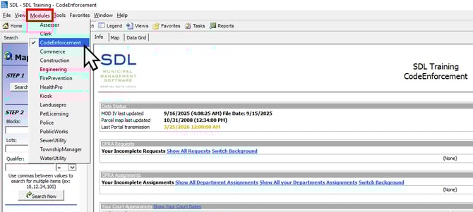 If you don’t see it, go to Modules, select Code Enforcement from the drop-down, and wait for the module to load.