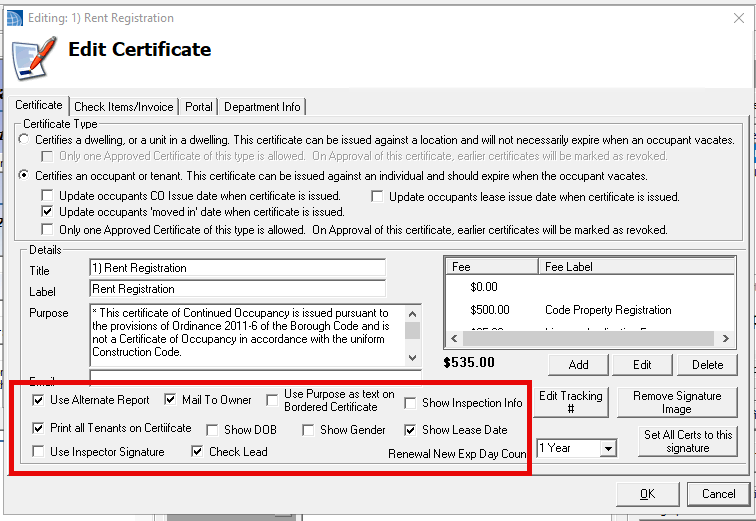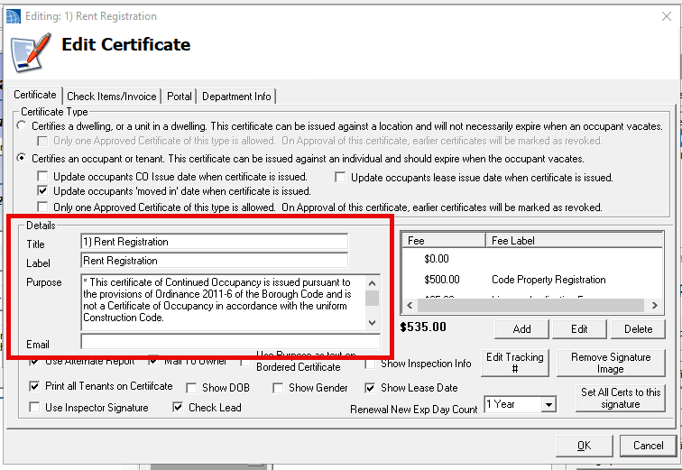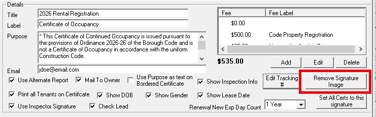 Know the approved legal Purpose text — This text appears on the certificate. Wording requirements vary by municipality; confirm your locally approved language before setup.