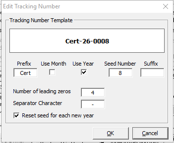 Tracking Numbers: If a numbering system is required, check Edit Tracking #, update the sequence formatting as needed, and click OK.