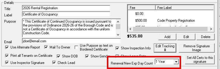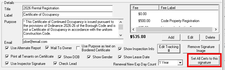 Email: Enter an email address here (like a department head or inspector) if you want a copy of the certificate automatically sent to a specific persons inbox every time this type of certificate is created.