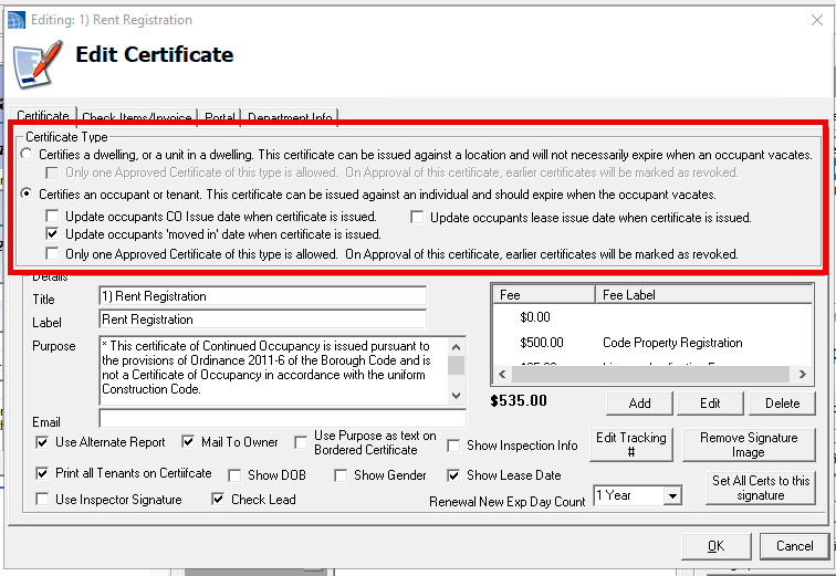 Certifies an occupant or tenant. Use when the certificate is tied to the occupant, such as a Rental Registration. Use the checkboxes to note any additional circumstances that may apply.