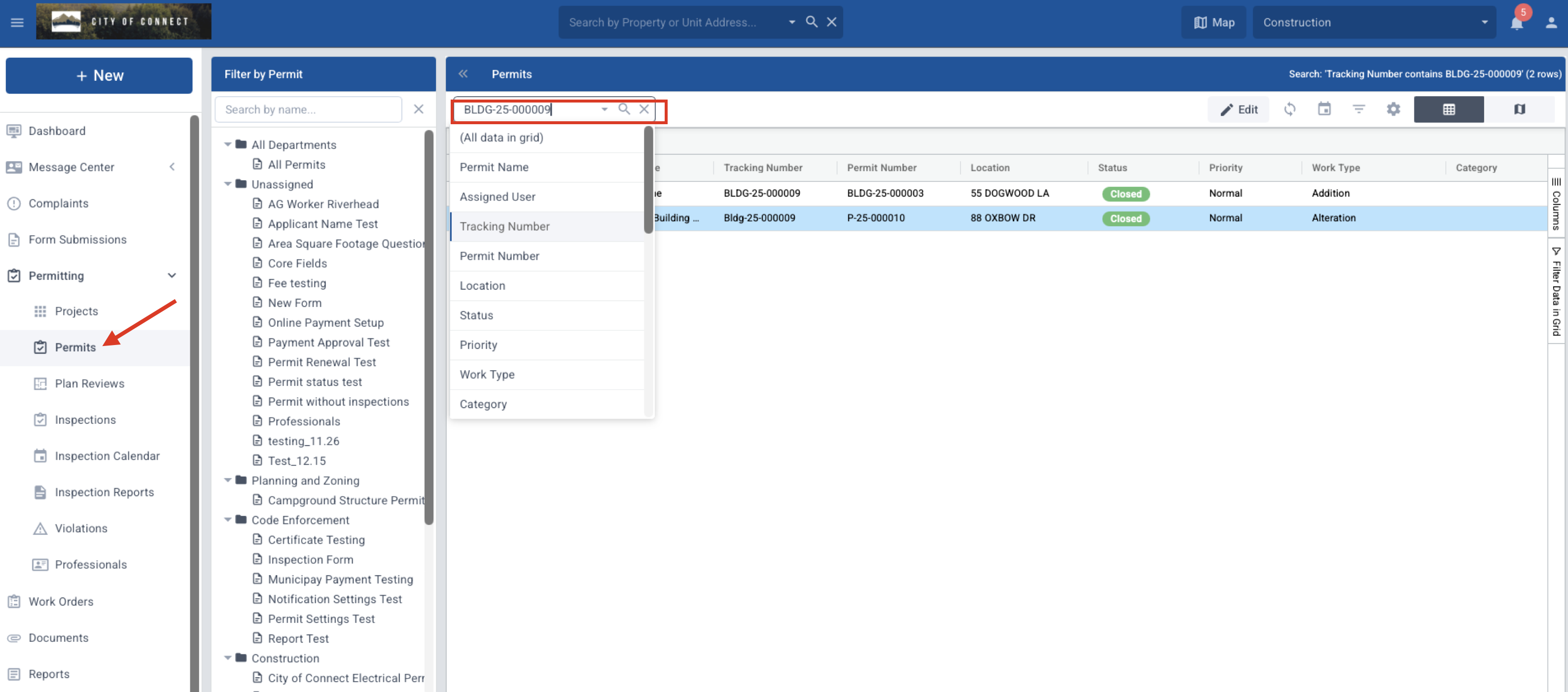 Search: Use the search bar at the top to enter the Permit Number or Tracking Number.
