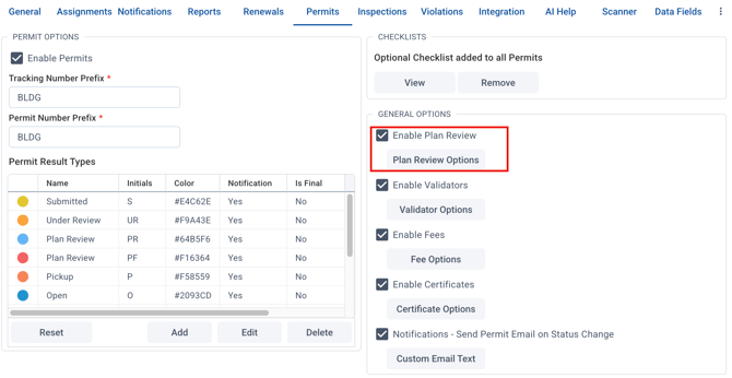 With permits enabled, check the box beside "Enable Plan Review" to turn on OPR options.