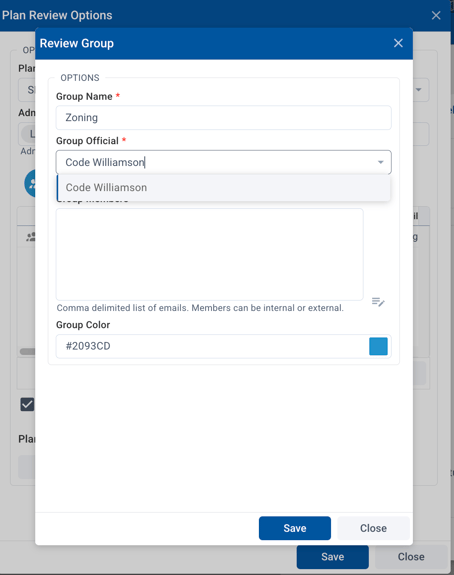 - Add in Review Groups. Each Review Group needs one Review Group Official. Adding other review group members is optional. You must have at least one Review Group but you can have multiple. Groups can be added here or in the Online Plan Review page after the plan review is created. The Review Group Official must have an SDL Connect user account with Online Plan Review permissions.