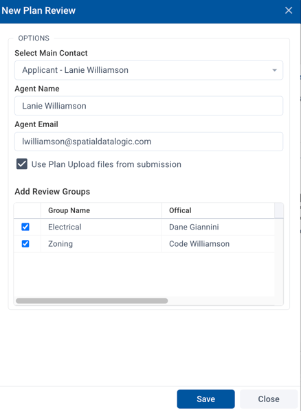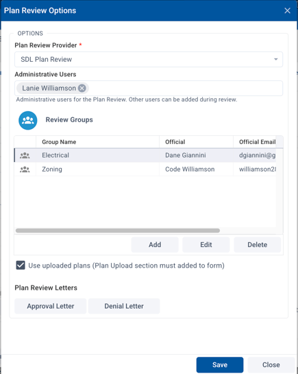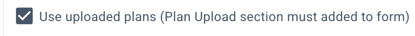 Most of the time, you will want to leave the option to "Use uploaded plans (Plan Upload section must be added to form)" checked. This will allow plans that were uploaded with the application to be used in the review.