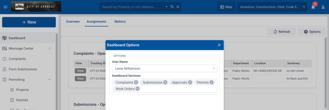 Assigned Users can also see permits/forms assigned to them in the Dashboard by choosing Assignments. They will need to choose Options and select their name: