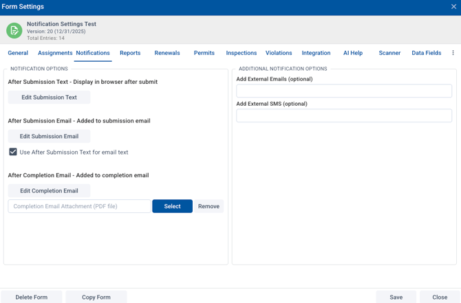 3. The last option for notification when a permit/form is submitted is using the external email notification. This is set up in the Form Designer in the Notification tab. Under "Add External Emails" you can add as many as needed. They will receive an email when a new permit/form is submitted.