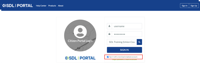 Note that you must select the option to “sign in with a municipal employee account” (see screenshot) to be able to choose your municipality or site. Once that is checked, a third box will appear allowing you to search for and select your group.