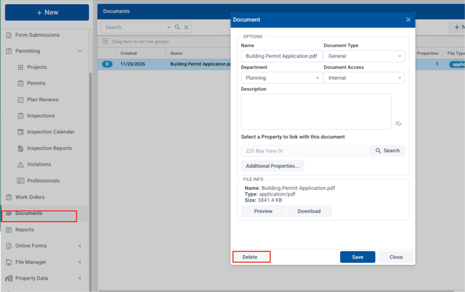 You can delete documents from the Documents tab in the leftside menu, not from the Documents section on the property page.