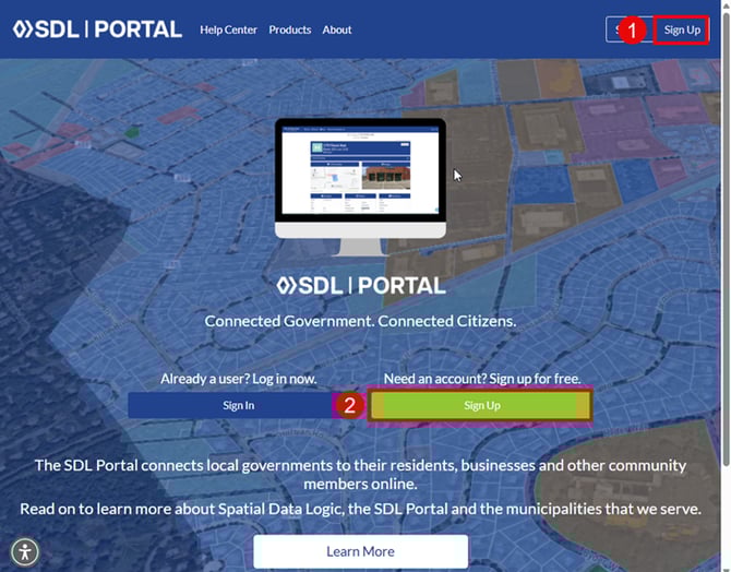 The resident navigates to www.sdlportal.com in their browser. They click the "Sign Up" button — either in the top-right corner or in the center of the page.