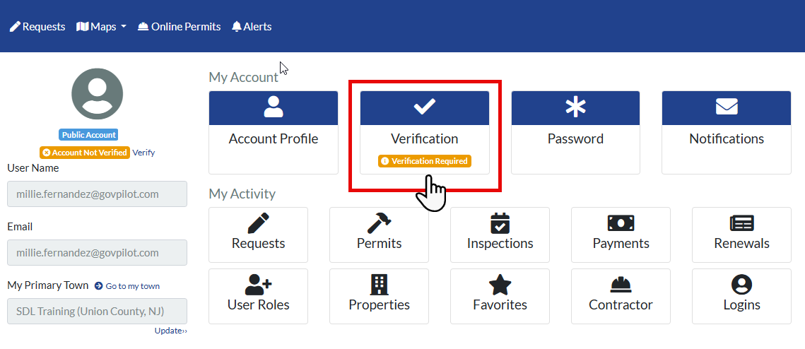 - On the My Account page, click the Verification tile (it will show a Verification Required warning).