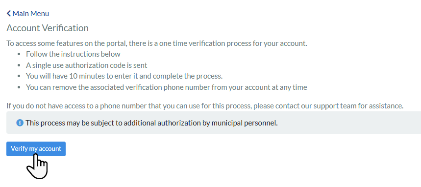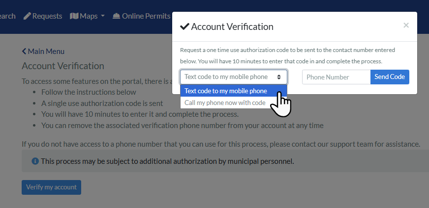 - Phone verification may be required. This depends on your town's settings. Without it, residents can still log in but may not be able to submit certain requests.