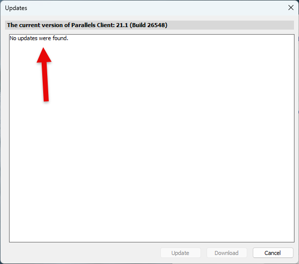 If a newer version is available, a window appears showing information about your current version and the new version side by side. Click Update to download and install it. Parallels Client will briefly close and reopen once the update finishes — and in some cases, your computer will prompt you to restart.