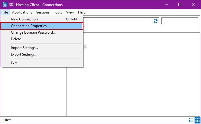 Once the SDL Hosting/Parallels client is open, select File, then Connection Properties: