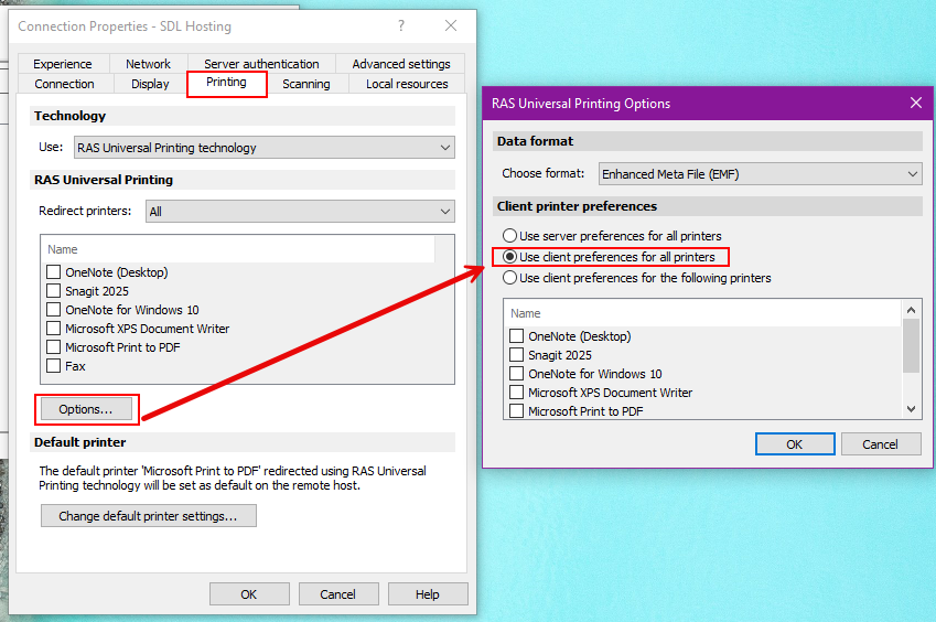 When in the next window, click on the Printing Tab, Options button, and ensure the Client Printer Preference area has the ‘Use client preferences for all printers’ radio button selected.
